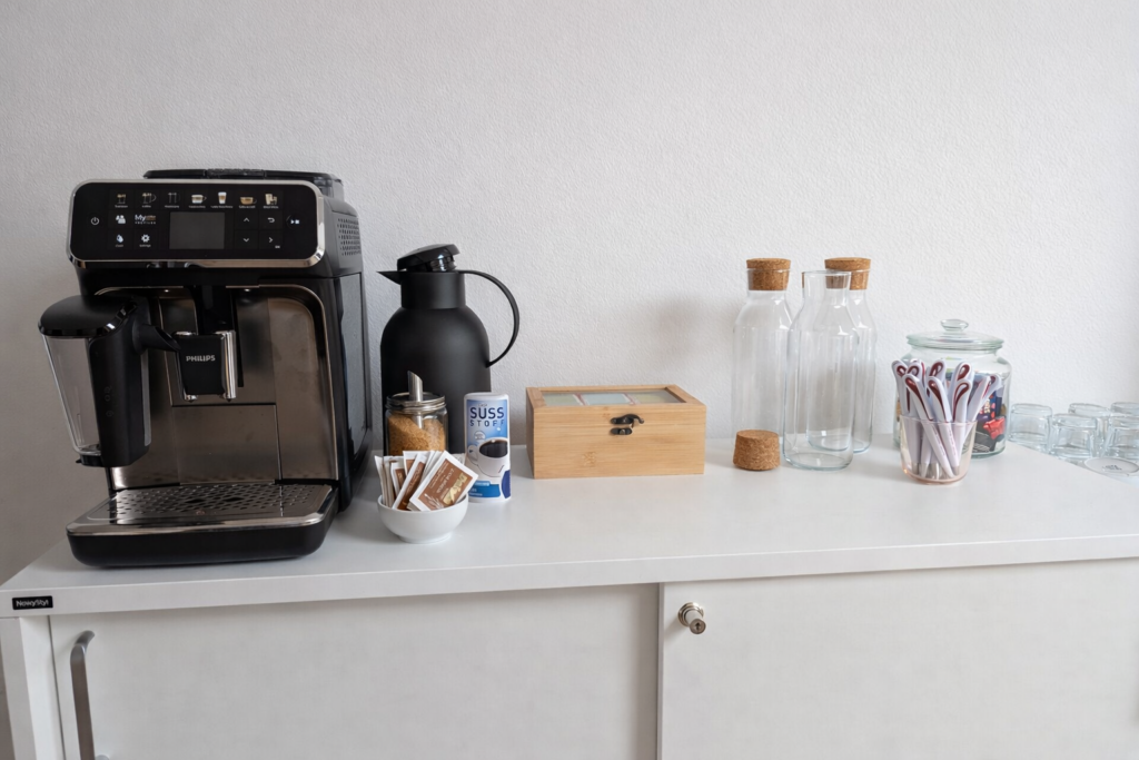 Für das leibliche Wohl sorgen ein Kaffeevollautomat, Tee und „Nervennahrung“. Flipchart, Pinnwand sowie Klimaanlage, Luftreiniger und Beamer sind ebenfalls vorhanden.