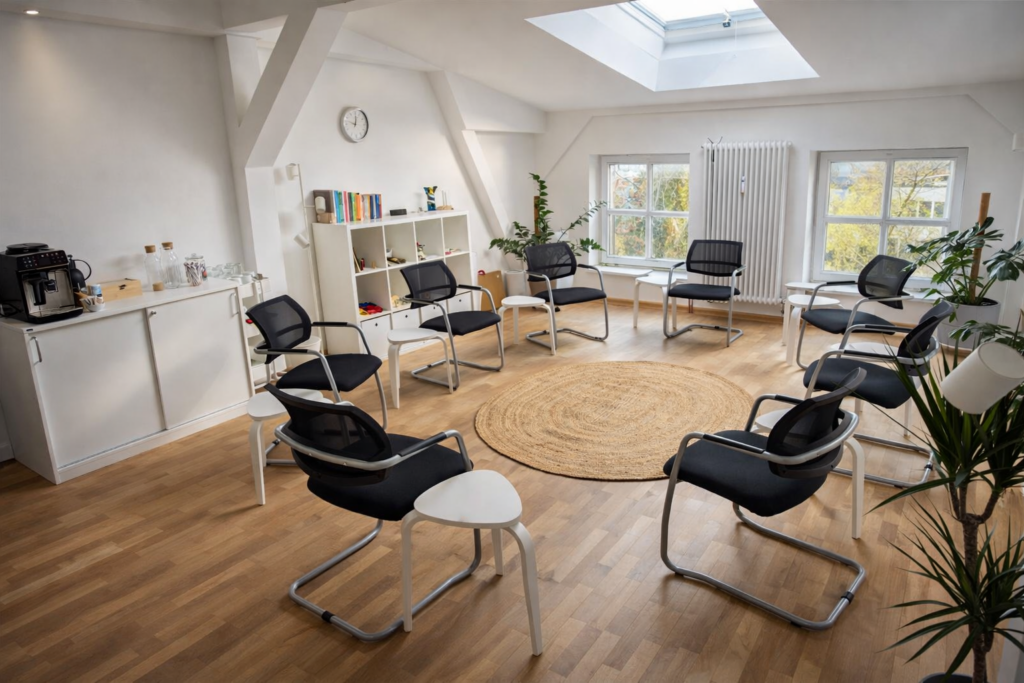 Der Raum bietet ausreichend Platz (31 m²) und ist mit zehn bequemen Freischwingern sowie praktischen Beistelltischen ausgestattet. Sollten mehr Sitzplätze benötigt werden, können bis zu acht weitere Stapelstühle problemlos hinzugefügt werden.