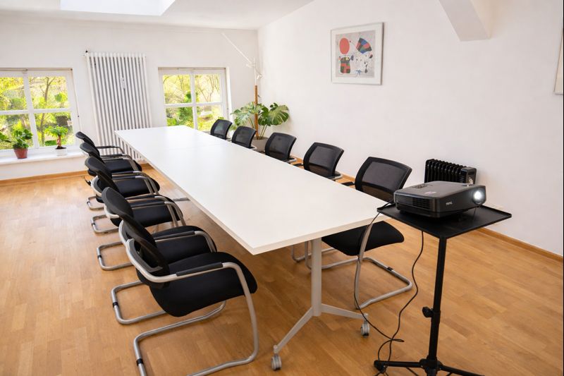 Für Weiterbildungen oder Workshops ist der Raum zusätzlich mit zwei mobilen Seminartischen (Maße: B 180 cm x T 80 cm x H 75 cm) ausgestattet. Bei Bedarf kann ein zusätzlicher Besprechungsraum in der gleichen Etage für Kleingruppenarbeit genutzt werden.